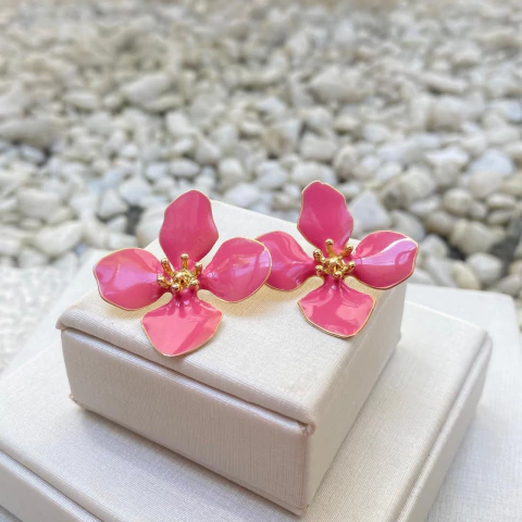 Brinco flor esmaltada rosa aberta miolo pontilhado dourado